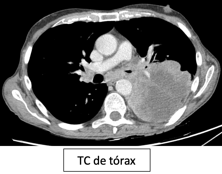 Masa pulmonar posterior izquierda heterogénea. Ocupación mediastínica e hiliar contralateral.