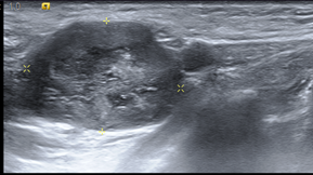 Mama hipoecogenica heterogénea con múltiples focos ecogénicos en relación con microcalcificaciones vistas en mamografía. lo anterior, se corresponde a un BIRADS 6, que se corresponde con un carcinoma ductal localmente avanzado con diagnóstico anatomopatológico.