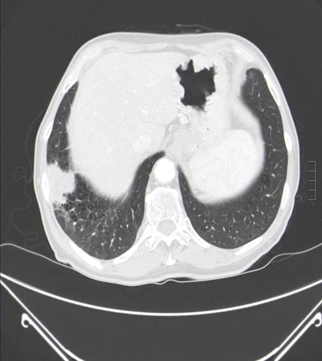 Masa en lóbulo inferior derecho (LID), compatible con neoplasia primaria pulmonar.