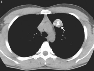 Una vez estudiados los hallazgos radiológicos que nos ofrece la radiografía simple, que en el caso que nos atañe se trata de un nódulo radiodenso en el lóbulo superior derecho, pasaríamos a realizar una prueba complementaria, que en este caso sería la TC simple. Hemos visto las ventajas que esta prueba complementaria tiene. Sin embargo, también se podrían realizar otras pruebas de imagen, como la TC con contraste, la resonancia magnética o el PET-TAC. Para el diagnóstico de un tumor carcinoide estaría indicado realizar un TC con contraste, ya que son tumores normalmente hipervasculares, por lo que con el contraste realzan muy bien. Ante la sospecha de un tumor carcinoide (tumor neuroendocrino) otra prueba diagnóstica que se podría realizar sería un octreoscan. Este estudio radiológico se trata de una gammagrafía de receptores de somatostatina. Se trata de inyectar en el paciente un análogo de la somatostatina, y observar si el nódulo realza, ya que los tumores neuroendocrinos tienen alta densidad de receptores para somatostatina. Además, este tipo de estudios no sólo nos localiza el tumor, sino que también nos pueden informar sobre posibles metástasis que existan.