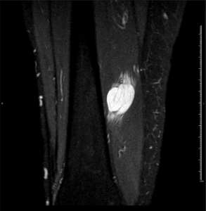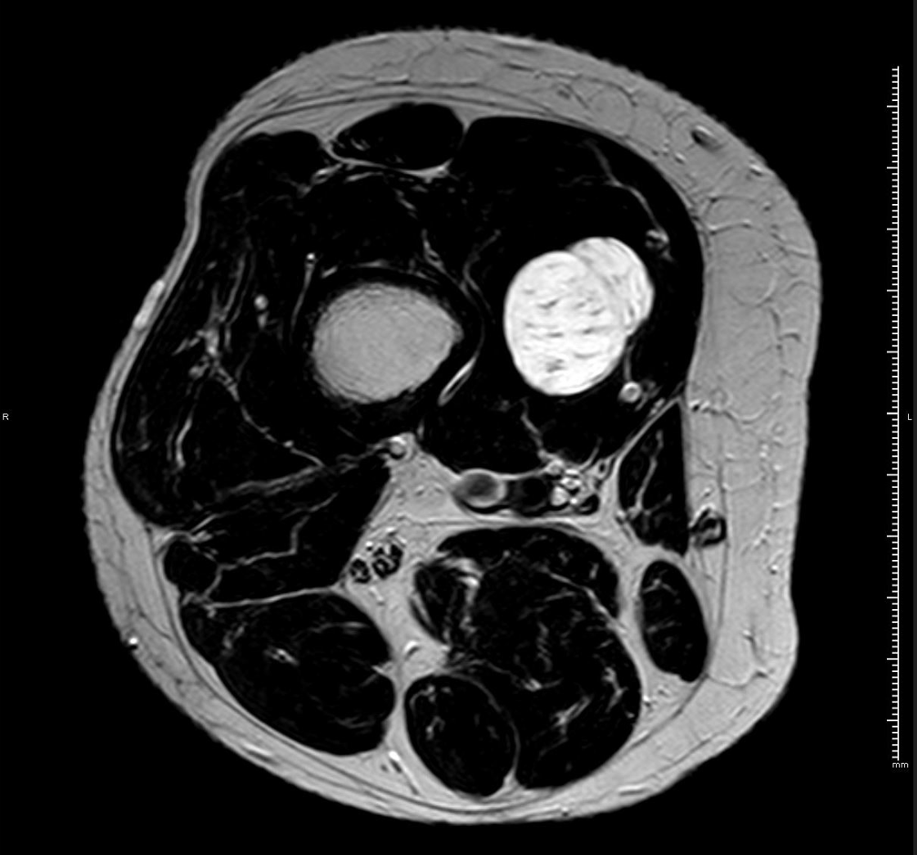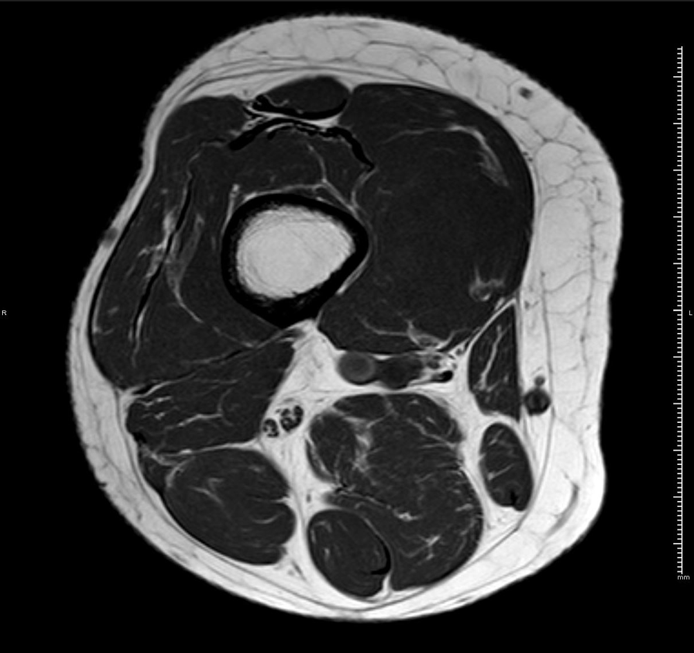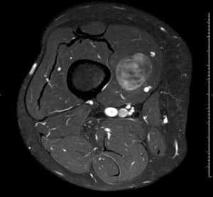 RM axial T1 con supresión grasa y gadolinio iv.