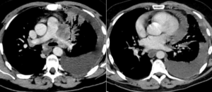 Masa pulmonar izquierda que afecta al bronquio izquierdo y estrecha la arteria pulmonar. Colección pleural y pericárdica.