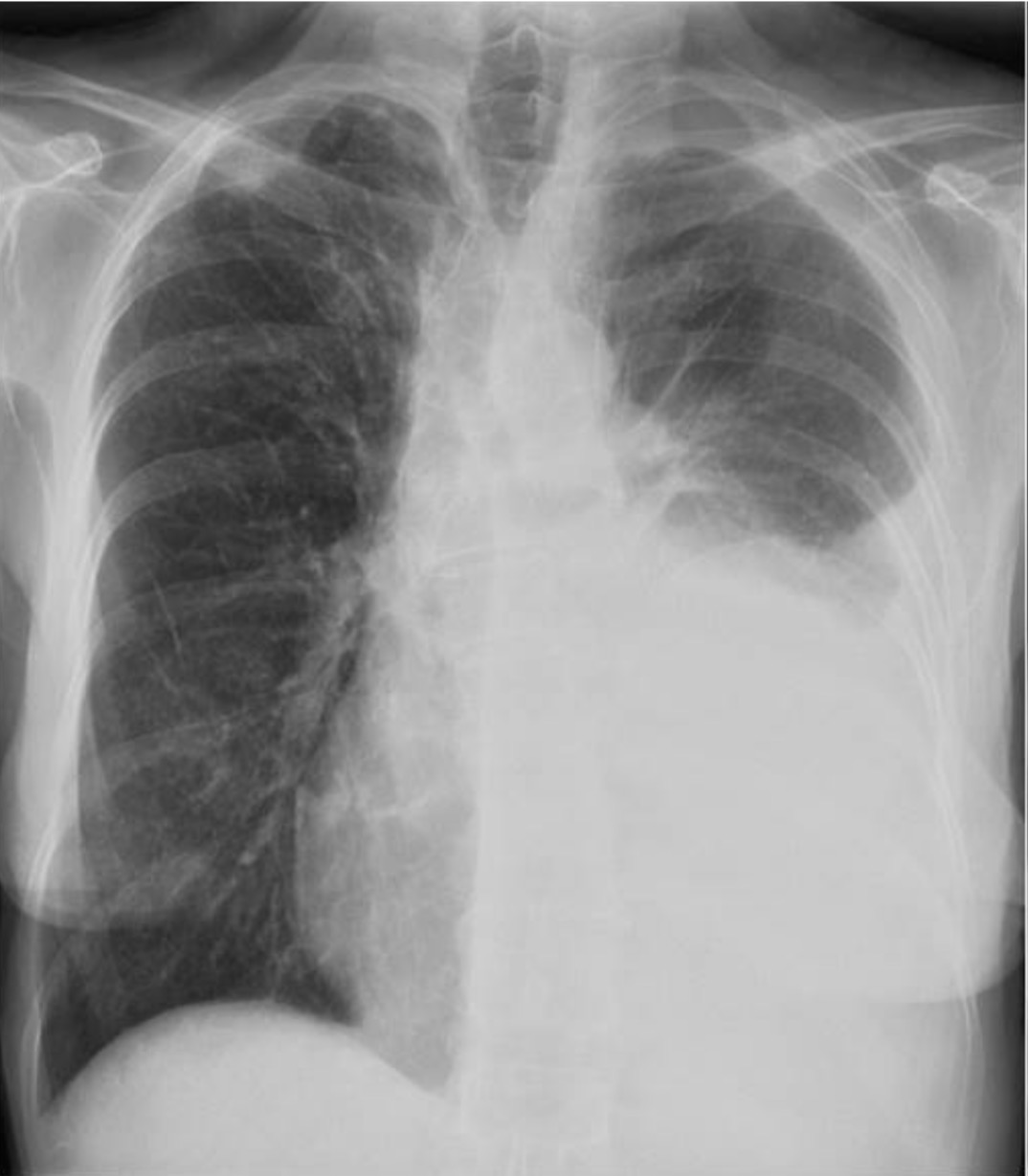 Opacidad homogénea bien delimitada en el hemitórax izquierdo con desplazamiento mediastínico hacia la izquierda.
