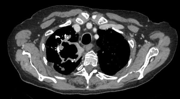 Lesión apical derecha cavitada con pared gruesa irregular con calcificaciones, sin adenopatías mediastínicas