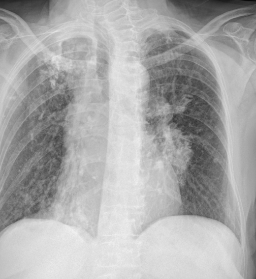 Opacidad heterogénea en vértice pulmonar derecho con engrosamiento pleural apical